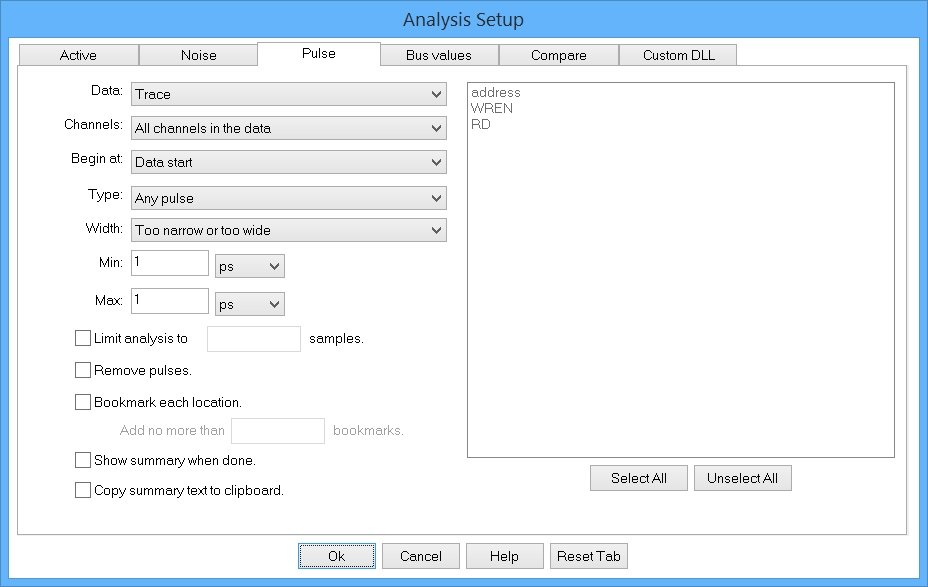 | Find pulses narrower than the minimum time OR wider than the maximum time. |
