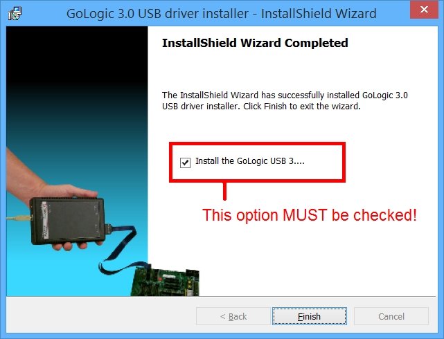 Verify the "Install the GoLogic USB driver" option is checked at the end of the install wizard...