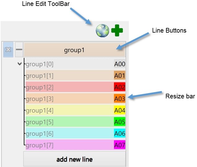 The Line Edit Area is on the left side of the WaveForm view. The Line Edit Area is used to configure each waveform line.